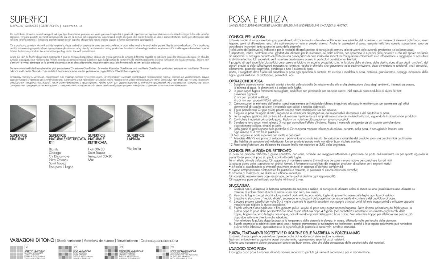 Da sehr unterschiedliche Einsatzbereiche gibt, produzierten Cir mehrere Oberflächen. Es werden klassische Oberflächen und rutschfeste Oberflächen produziert, entweder mit rutschfesten Glasuren