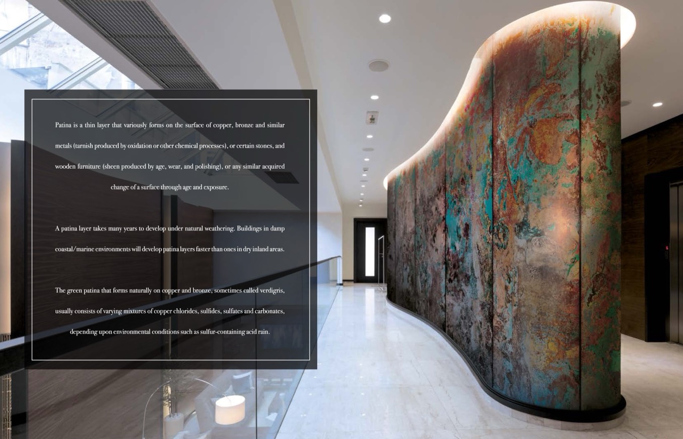 Patina is a thin layer that variously forms on the surface of copper, bronze and similar