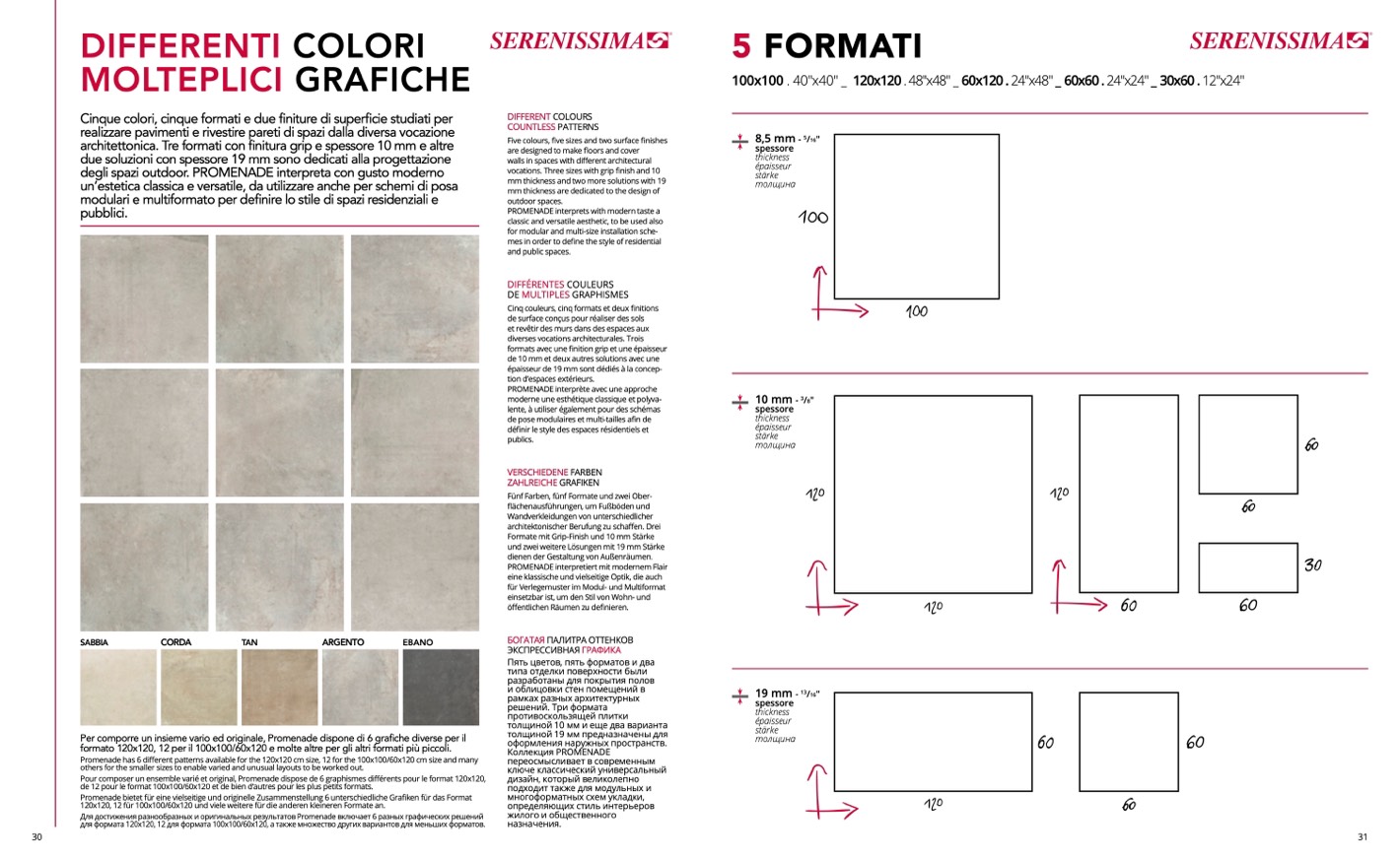 Promenade has 6 different patterns available for the 120x120 cm size, 12 for the 100x100/60x120 cm size and many