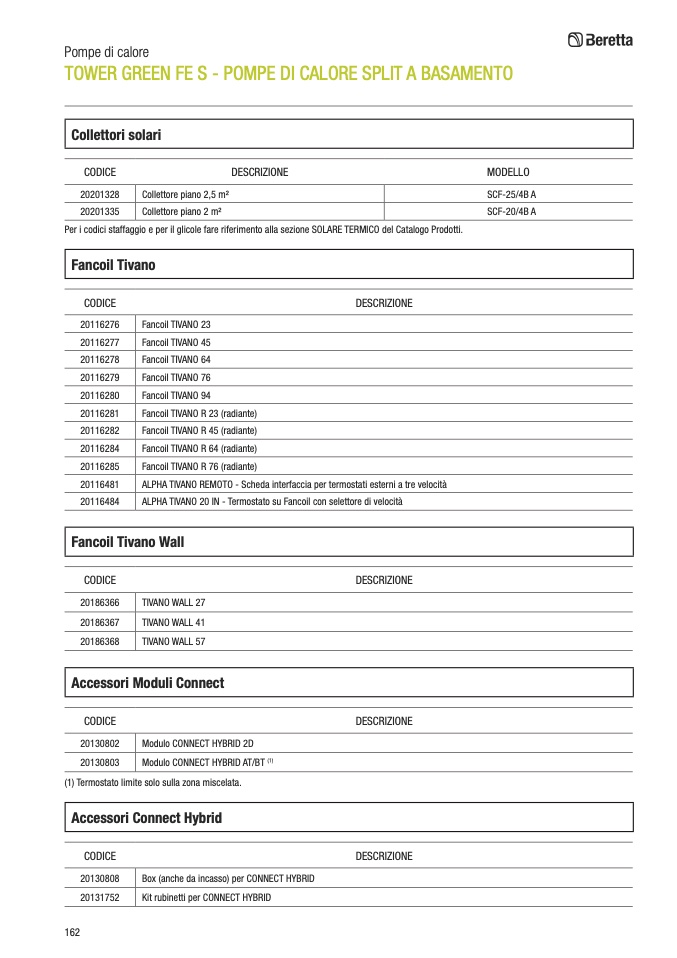 Per i codici staffaggio e per il glicole fare riferimento alla sezione SOLARE TERMICO del Catalogo Prodotti.