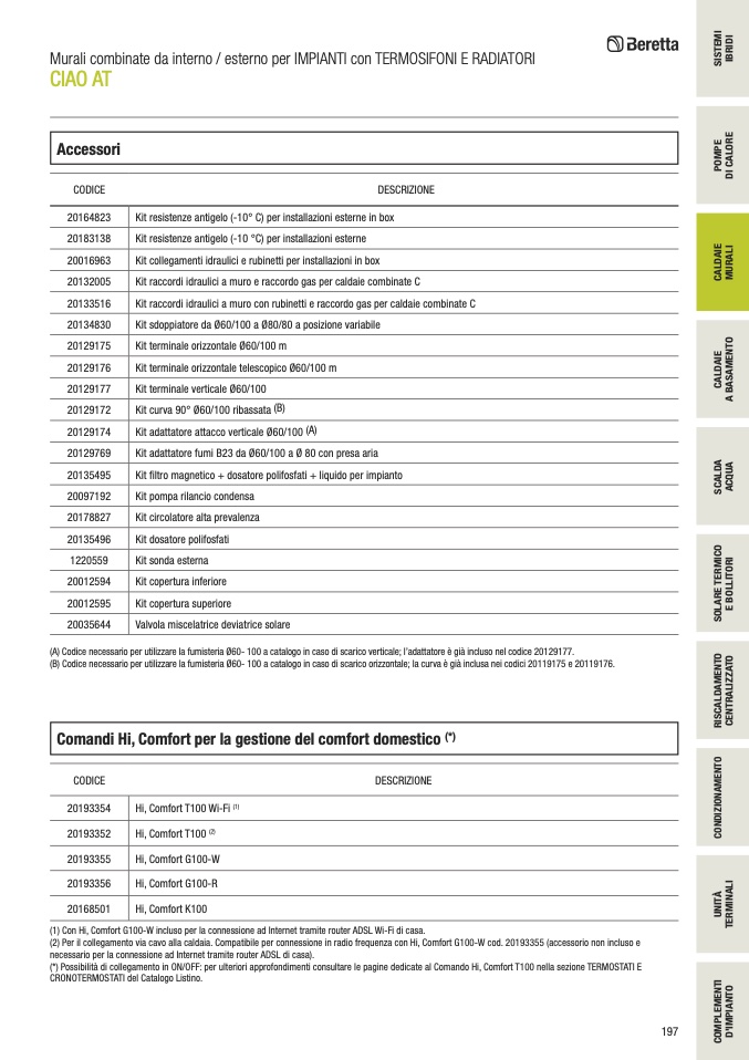 (B) Codice necessario per utilizzare la fumisteria Ø60- 100 a catalogo in caso di scarico orizzontale; la curva è già inclusa nei codici 20119175 e 20119176.