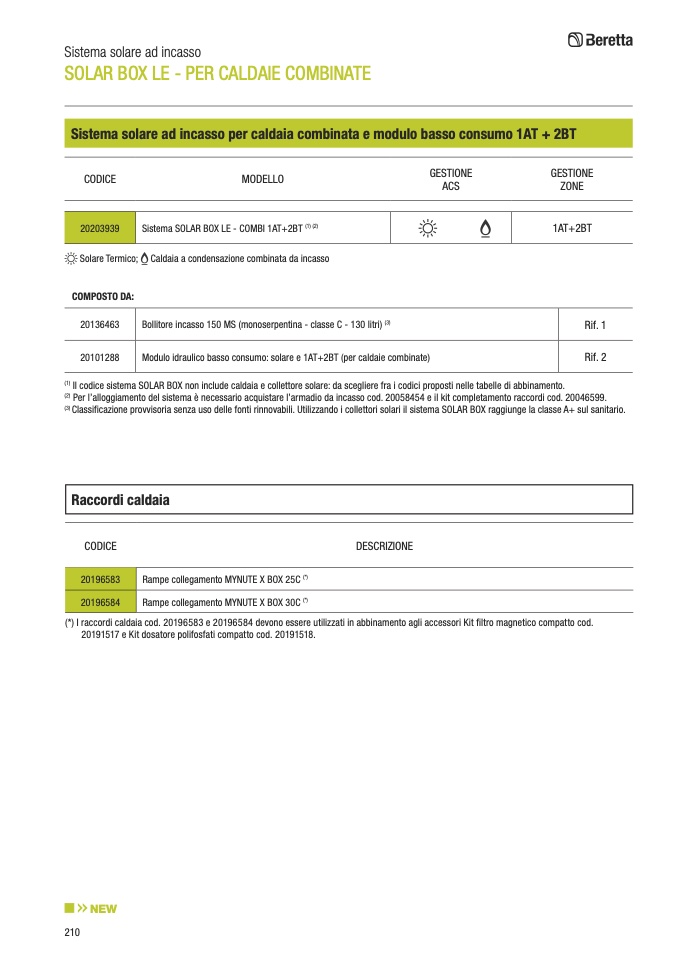 Il codice sistema SOLAR BOX non include caldaia e collettore solare: da scegliere fra i codici proposti nelle tabelle di abbinamento.
