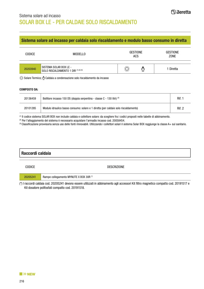 Il codice sistema SOLAR BOX non include caldaia e collettore solare: da scegliere fra i codici proposti nelle tabelle di abbinamento.