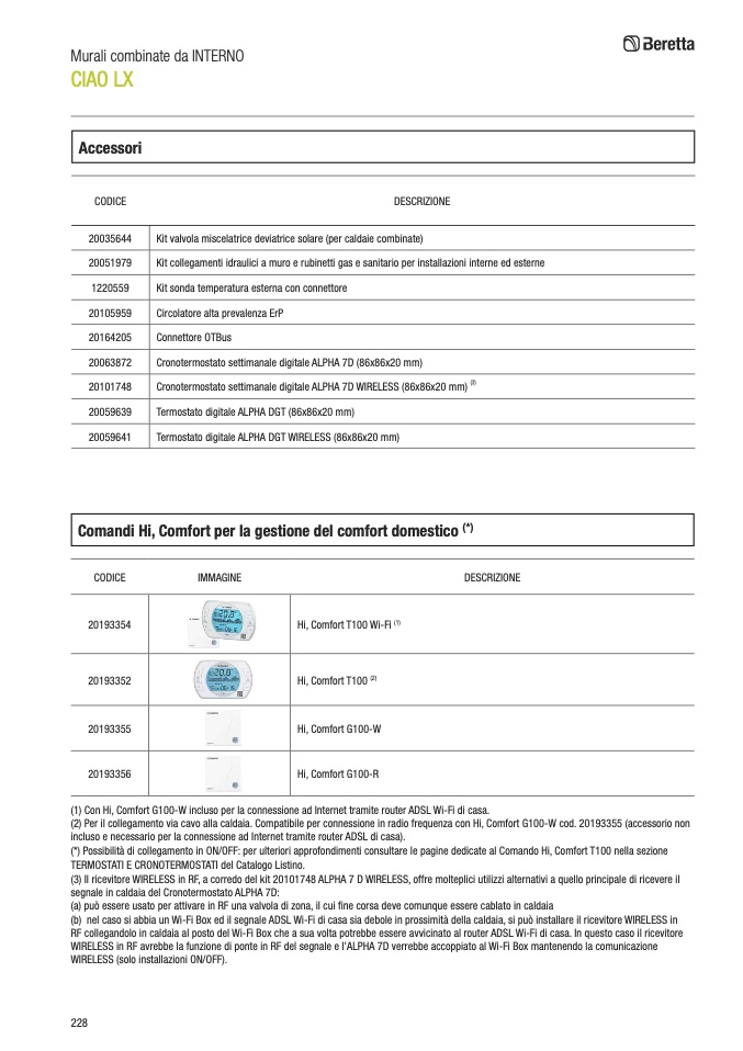 (2) Per il collegamento via cavo alla caldaia. Compatibile per connessione in radio frequenza con Hi, Comfort G100-W cod. 20193355 (accessorio non