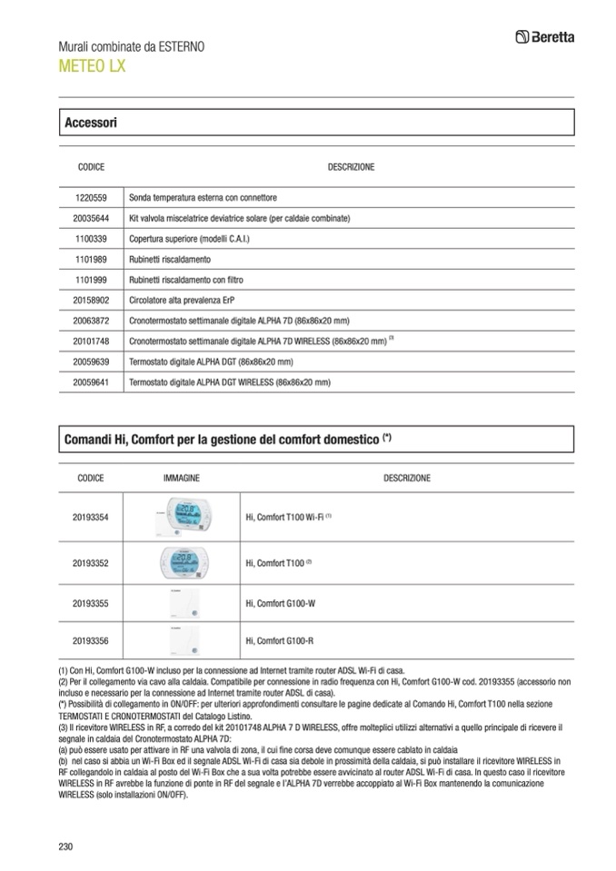 (2) Per il collegamento via cavo alla caldaia. Compatibile per connessione in radio frequenza con Hi, Comfort G100-W cod. 20193355 (accessorio non