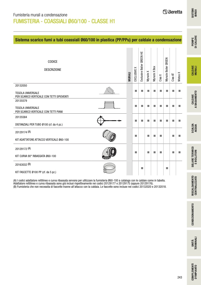 (A) I codici adattatore rettilineo e curva ribassata servono per utilizzare la fumisteria Ø60-100 a catalogo con le caldaie come in tabella.