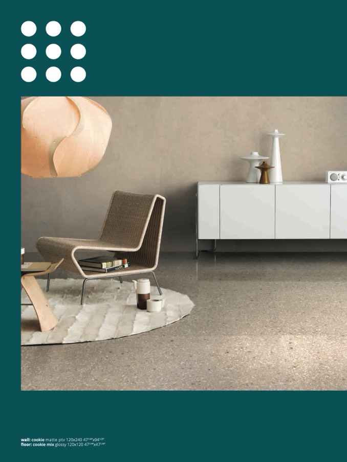 floor: cookie mix glossy 120x120 471/4”x471/4”