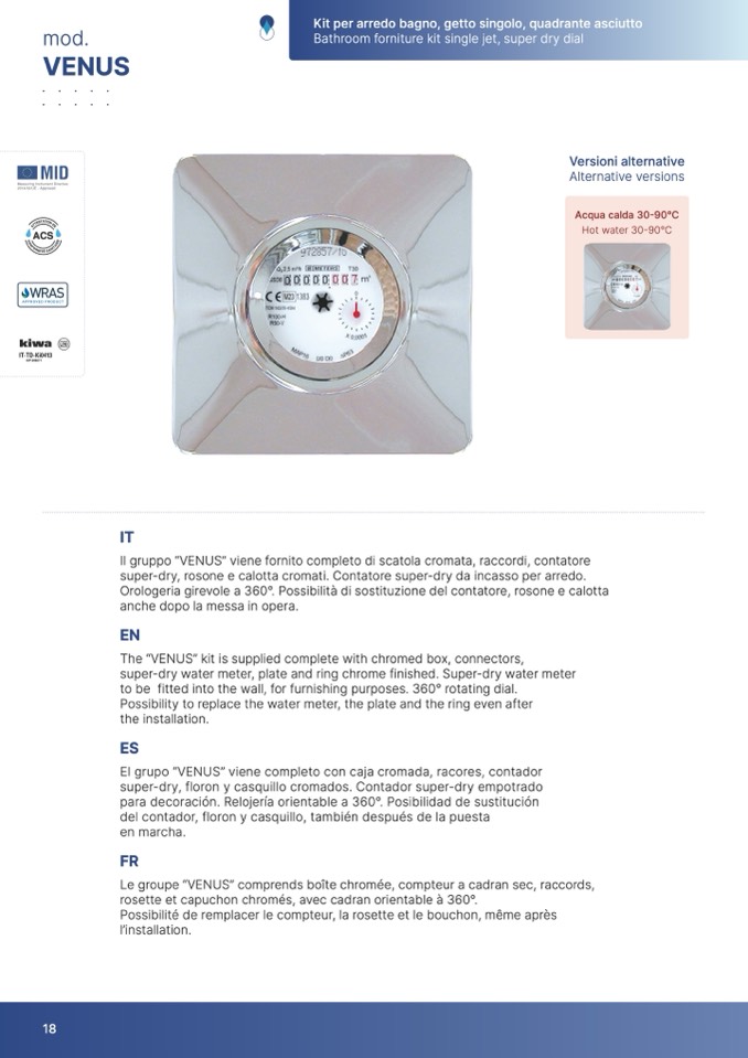 Il gruppo “VENUS” viene fornito completo di scatola cromata, raccordi, contatore