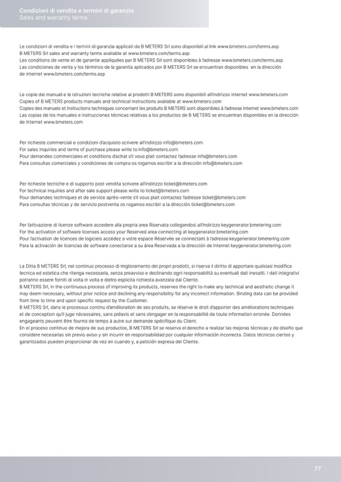 Le condizioni di vendita e i termini di garanzia applicati da B METERS Srl sono disponibili al link www.bmeters.com/terms.asp