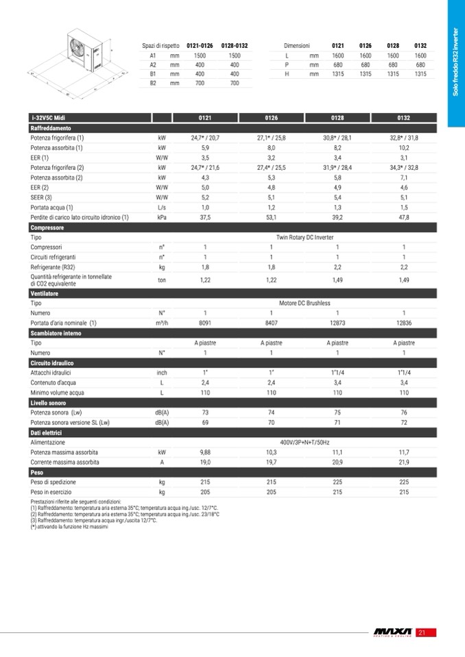 (1) Raffreddamento: temperatura aria esterna 35°C; temperatura acqua ing./usc. 12/7°C.
