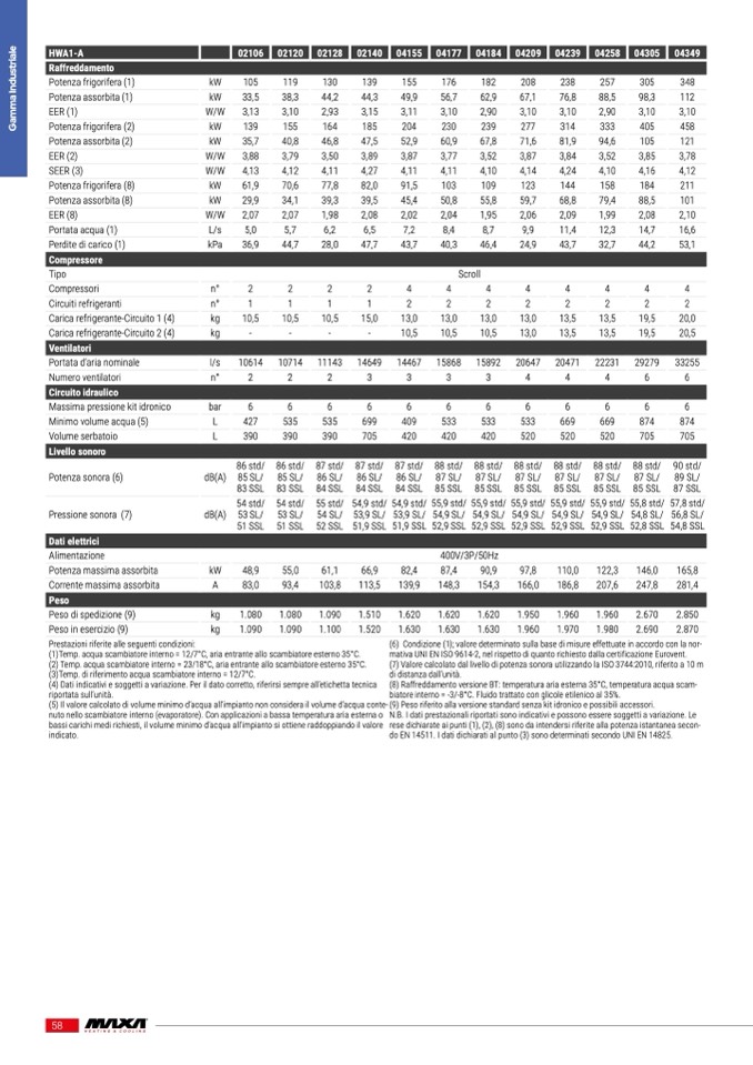 (1)Temp. acqua scambiatore interno = 12/7°C, aria entrante allo scambiatore esterno 35°C.
