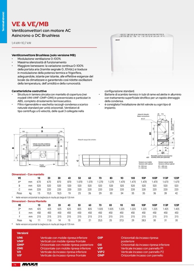 * Nelle versioni orizzontali la larghezza A risulta più larga di 120 mm