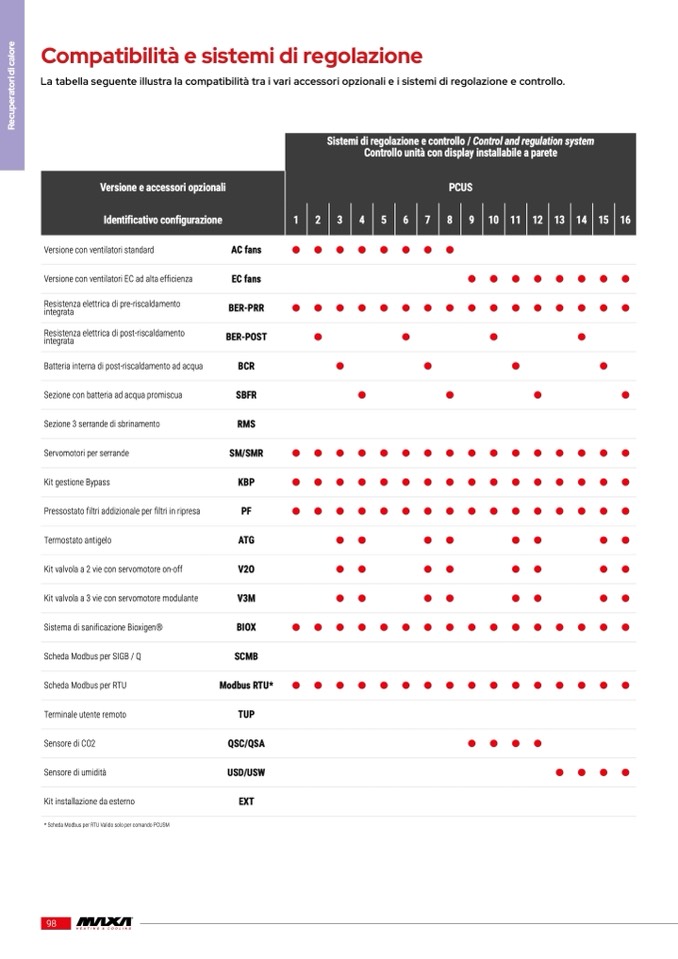 La tabella seguente illustra la compatibilità tra i vari accessori opzionali e i sistemi di regolazione e controllo.