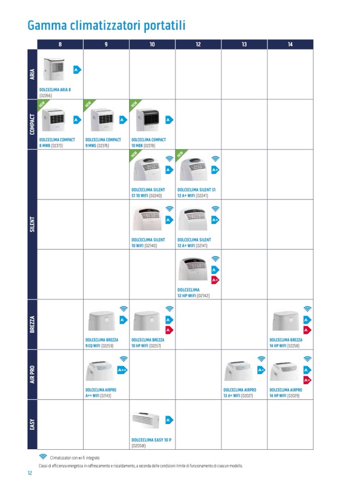 Classi di efficienza energetica in raffrescamento e riscaldamento, a seconda delle condizioni limite di funzionamento di ciascun modello.