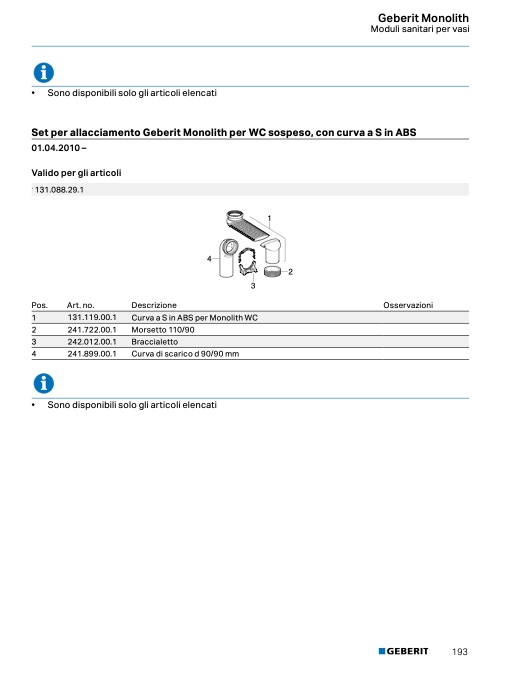 Set per allacciamento Geberit Monolith per WC sospeso, con curva a S in ABS