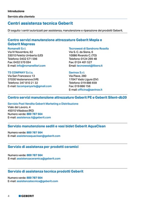 Di seguito i centri autorizzati per assistenza, manutenzione e riparazione dei prodotti Geberit.
