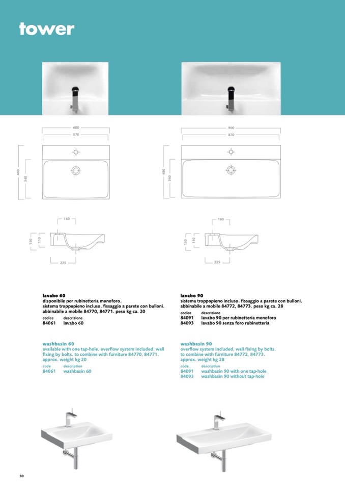 sistema troppopieno incluso. fissaggio a parete con bulloni.