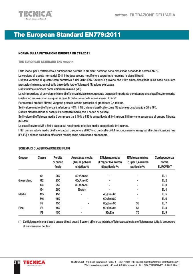 L’ultima versione di questo testo normativo è del 2012 (EN779:2012) e prevede che i filtri siano classificati sulla base delle loro