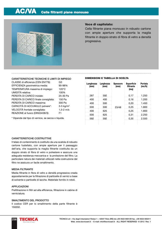 Cella filtrante piana monouso in robusto cartone