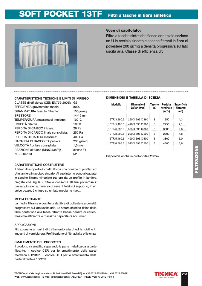 fibre conferisce alla tasca filtrante basse perdite di carico,