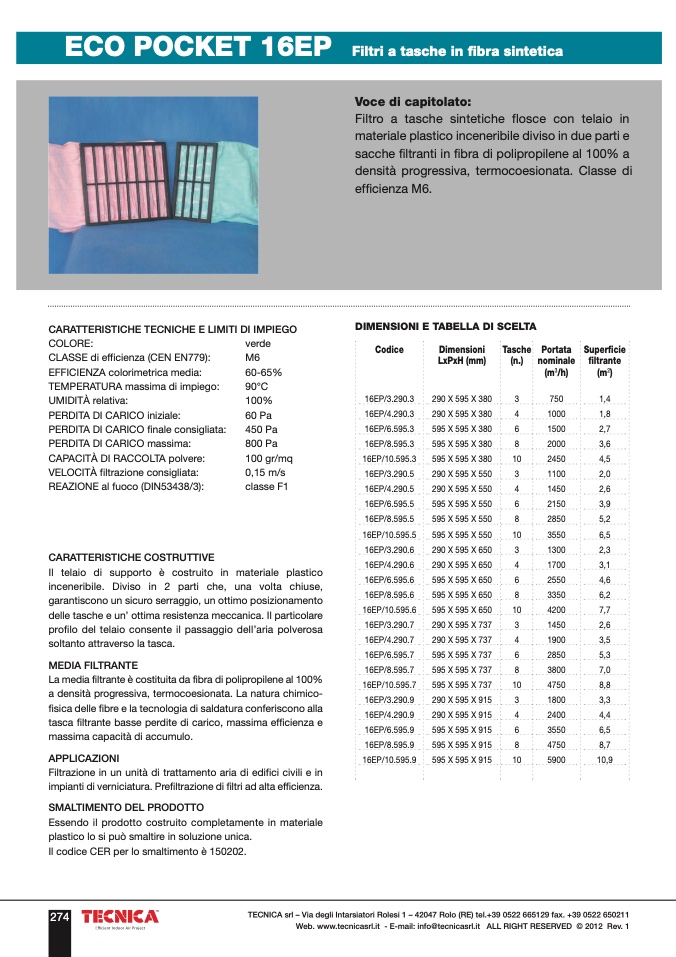 tasca filtrante basse perdite di carico, massima efficienza e