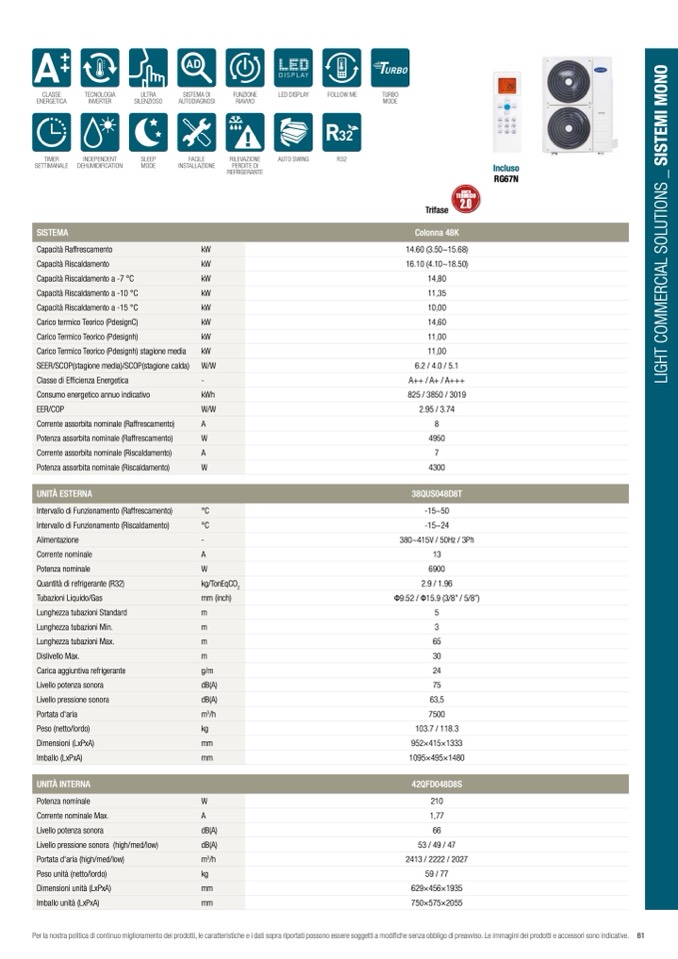 Per la nostra politica di continuo miglioramento dei prodotti, le caratteristiche e i dati sopra riportati possono essere soggetti a modifiche senza obbligo di preavviso. Le immagini dei prodotti e accessori sono indicative. 61