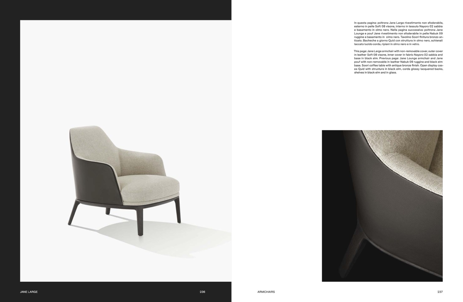 base in black elm. Previous page: Jane Lounge armchair and Jane