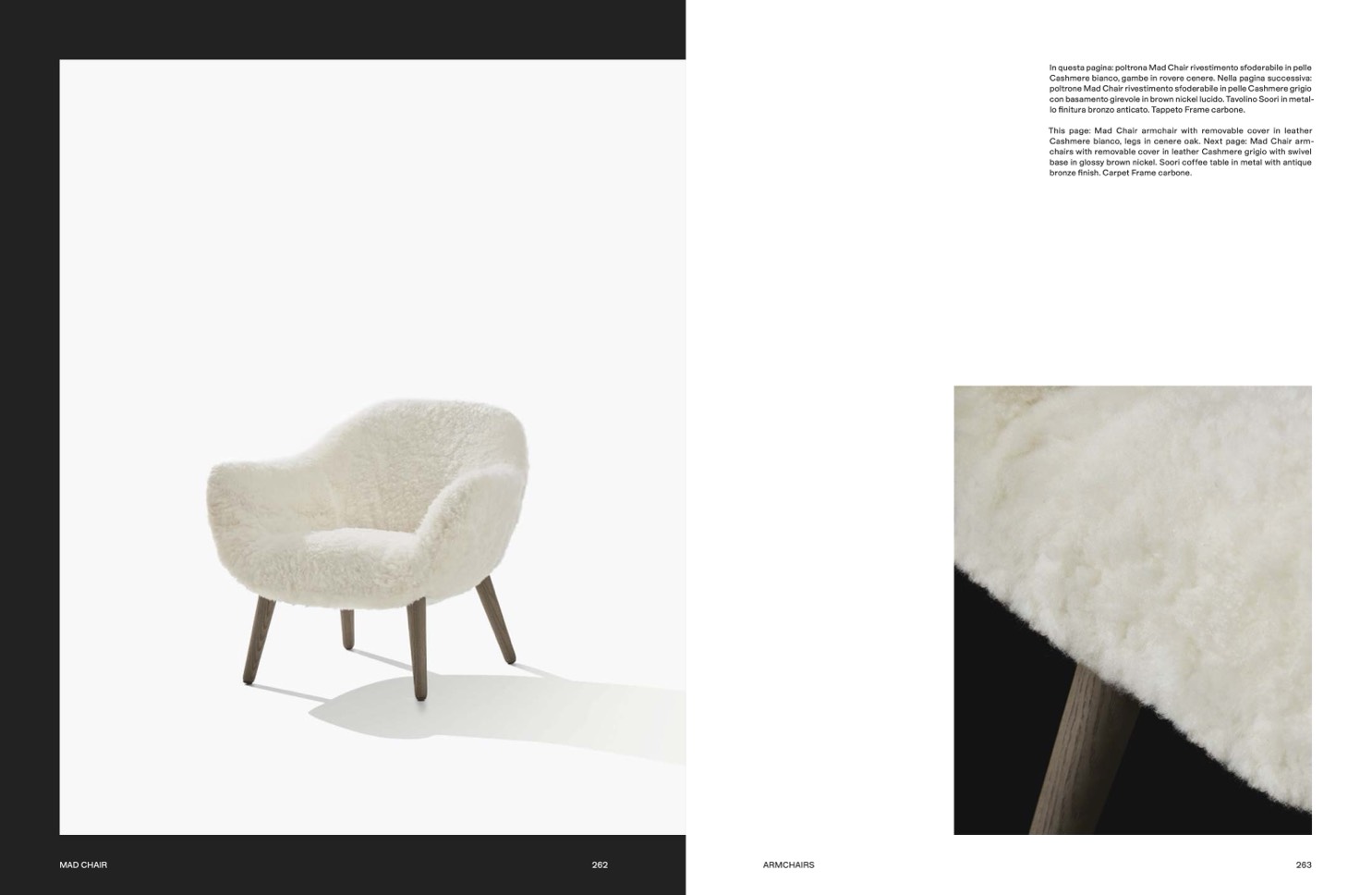 Cashmere bianco, legs in cenere oak. Next page: Mad Chair arm-