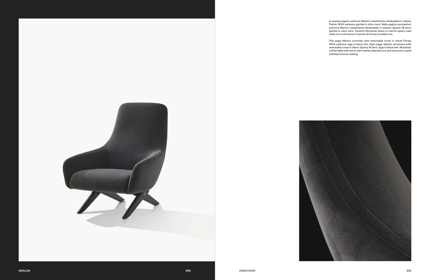 1404 carbone, legs in black elm. Next page: Marlon armchairs with