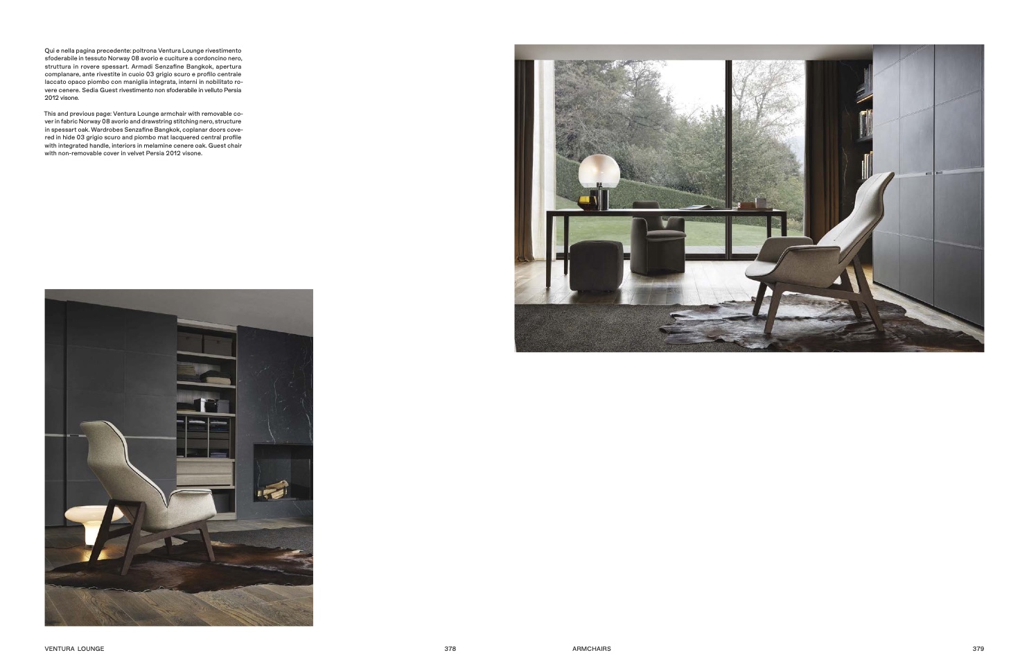 Qui e nella pagina precedente: poltrona Ventura Lounge rivestimento