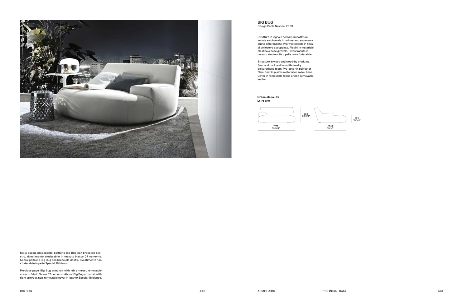 Nella pagina precedente: poltrona Big Bug con bracciolo sini-