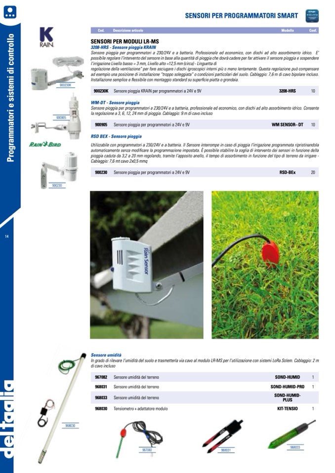 Utilizzabile con programmatori a 230/24V e a batteria. Il Sensore interrompe in caso di pioggia l’irrigazione programmata ripristinandola