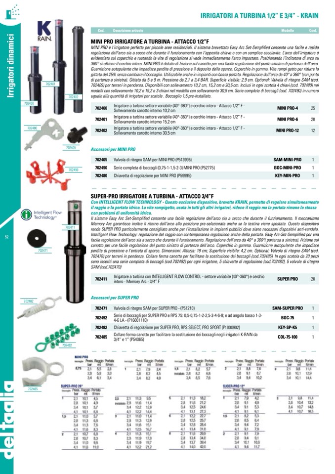 sono inseriti una serie completa di boccagli (cod.702492) per ogni irrigatore, 5 chiavette di regolazione (cod.702482), 5 valvole di ritegno