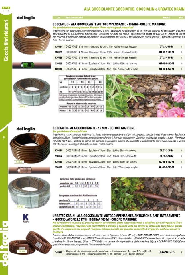In polietilene con gocciolatori autocompensanti da 2 e 4 l/h - Spaziatura dei gocciolatori 33 cm - Portata costante dei gocciolatori al variare