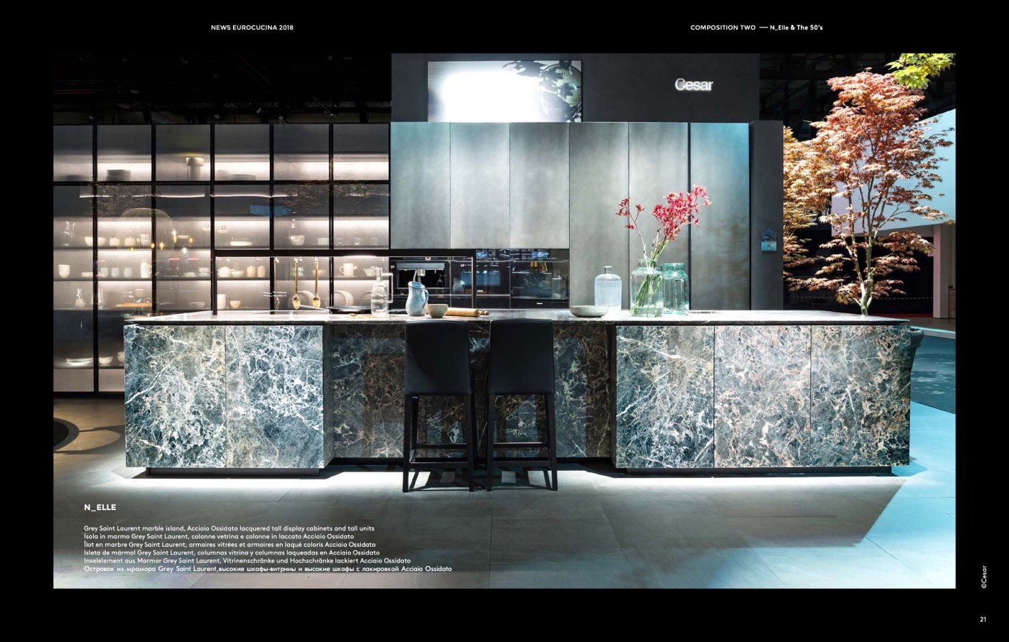 Островок из мрамора Grey Saint Laurent,высокие шкафы-витрины и высокие шкафы с лакировкой Acciaio Ossidato