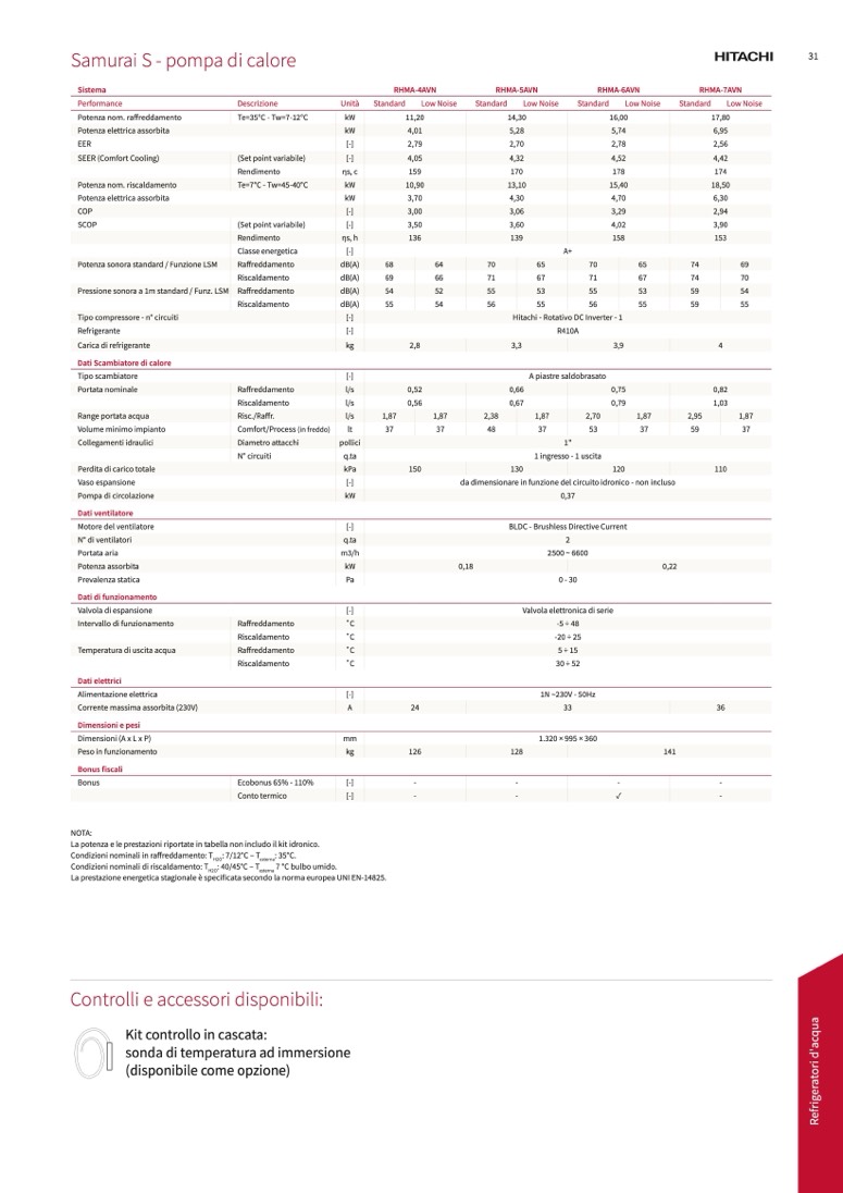 La potenza e le prestazioni riportate in tabella non includo il kit idronico.