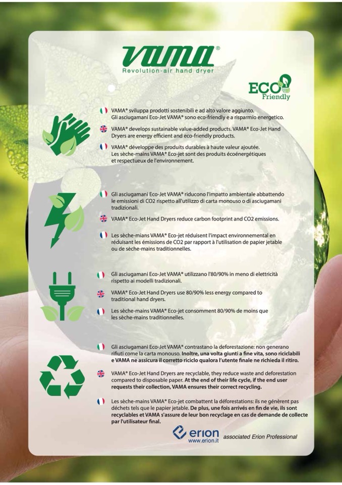 Gli asciugamani Eco-Jet VAMA® sono eco-friendly e a risparmio energetico.