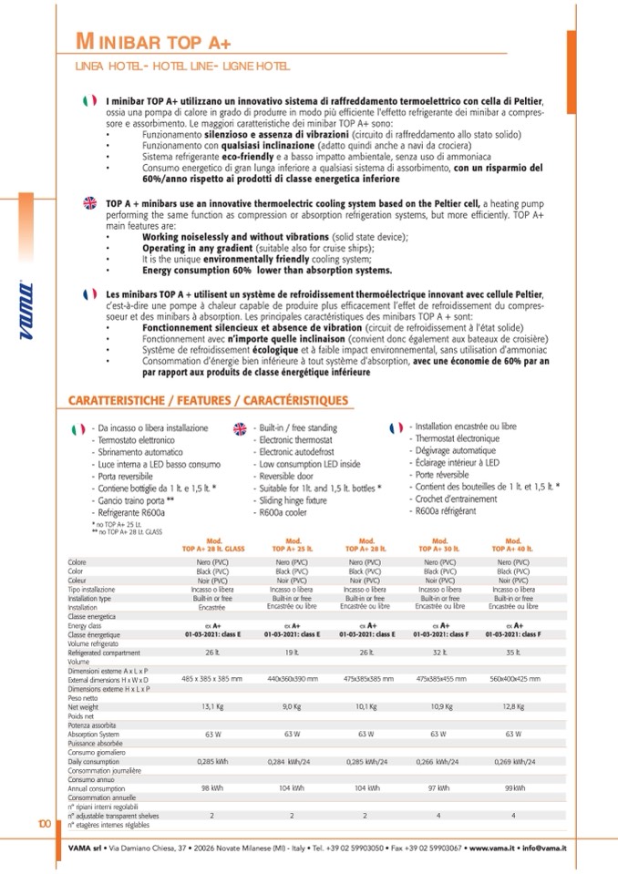 sore e assorbimento. Le maggiori caratteristiche dei minibar TOP A+ sono: