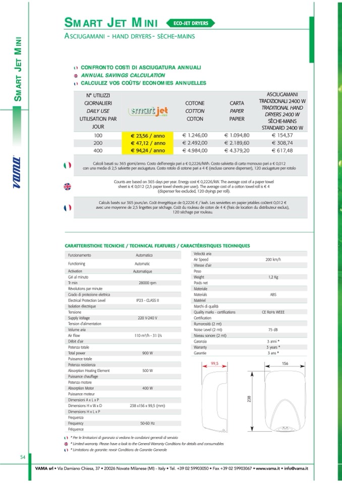 Calcoli basati su 365 giorni/anno. Costo dell’energia pari a € 0,2226/kWh. Costo salvietta di carta monouso pari a € 0,012