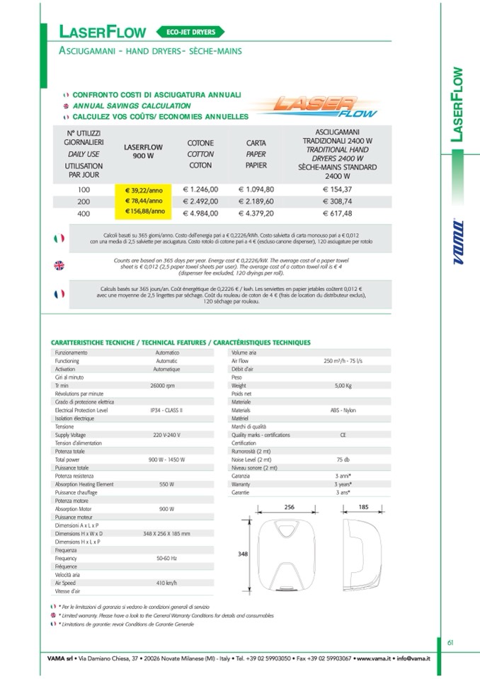 Calcoli basati su 365 giorni/anno. Costo dell’energia pari a € 0,2226/kWh. Costo salvietta di carta monouso pari a € 0,012