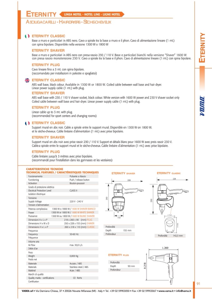 et le sèche-cheveux. Cable linéaire d’alimentation (1 mt.) avec prise bipolaire.