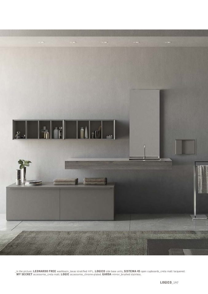 _in the picture: LEONARDO FREE washbasin_texas stratified HPL. LOGICO side base units, SISTEMA 45 open cupboards_creta matt lacquered.