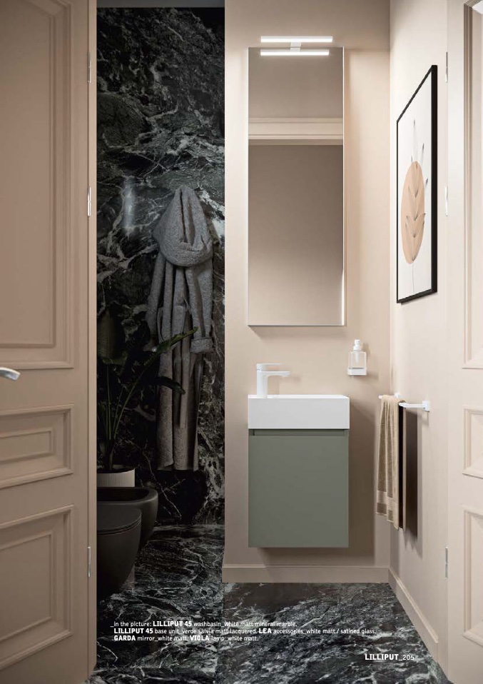 LILLIPUT 45 base unit_verde salvia matt lacquered. LEA accessories_white matt / satined glass.