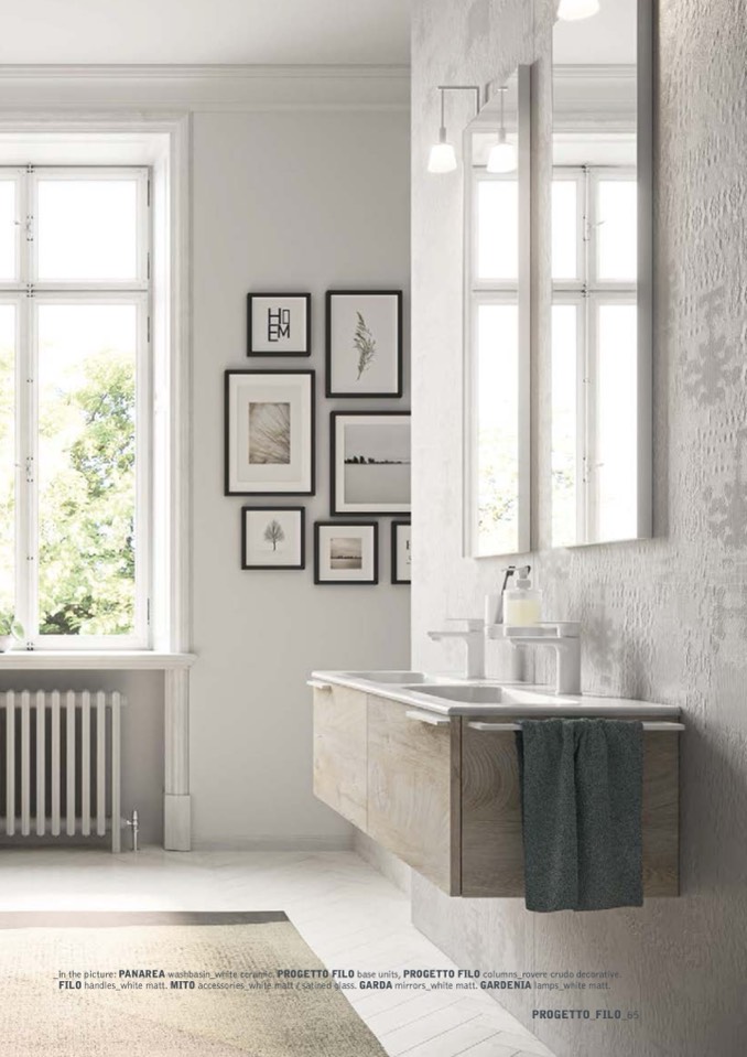 FILO handles_white matt. MITO accessories_white matt / satined glass. GARDA mirrors_white matt. GARDENIA lamps_white matt.