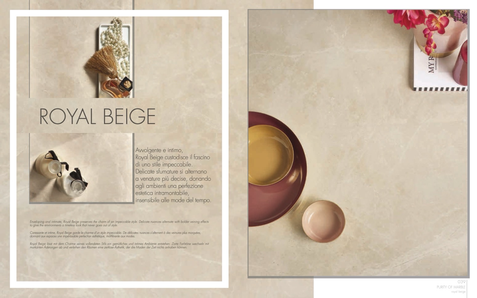 Enveloping and intimate, Royal Beige preserves the charm of an impeccable style. Delicate nuances alternate with bolder veining effects