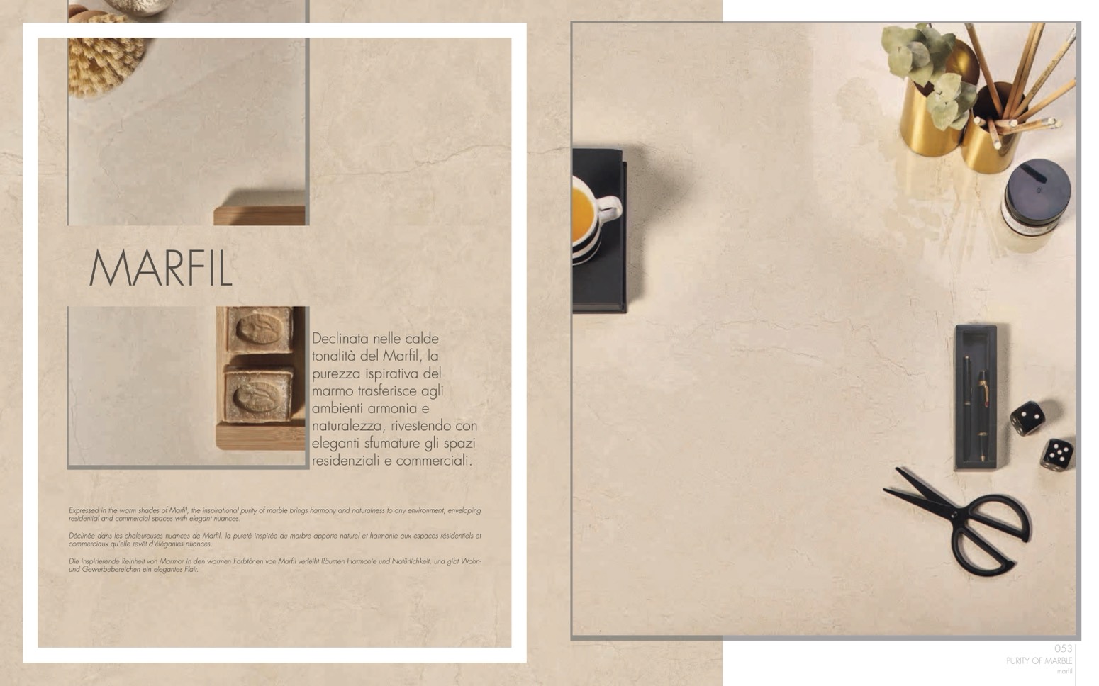 Expressed in the warm shades of Maril, the inspirational purity of marble brings harmony and naturalness to any environment, enveloping