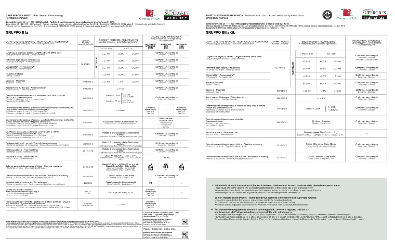 Norma di riferimento: EN 14411 (ISO 13006) Allegato G - Piastrelle di ceramica pressate a secco con basso assorbimento d’acqua (Ev 0,5%)