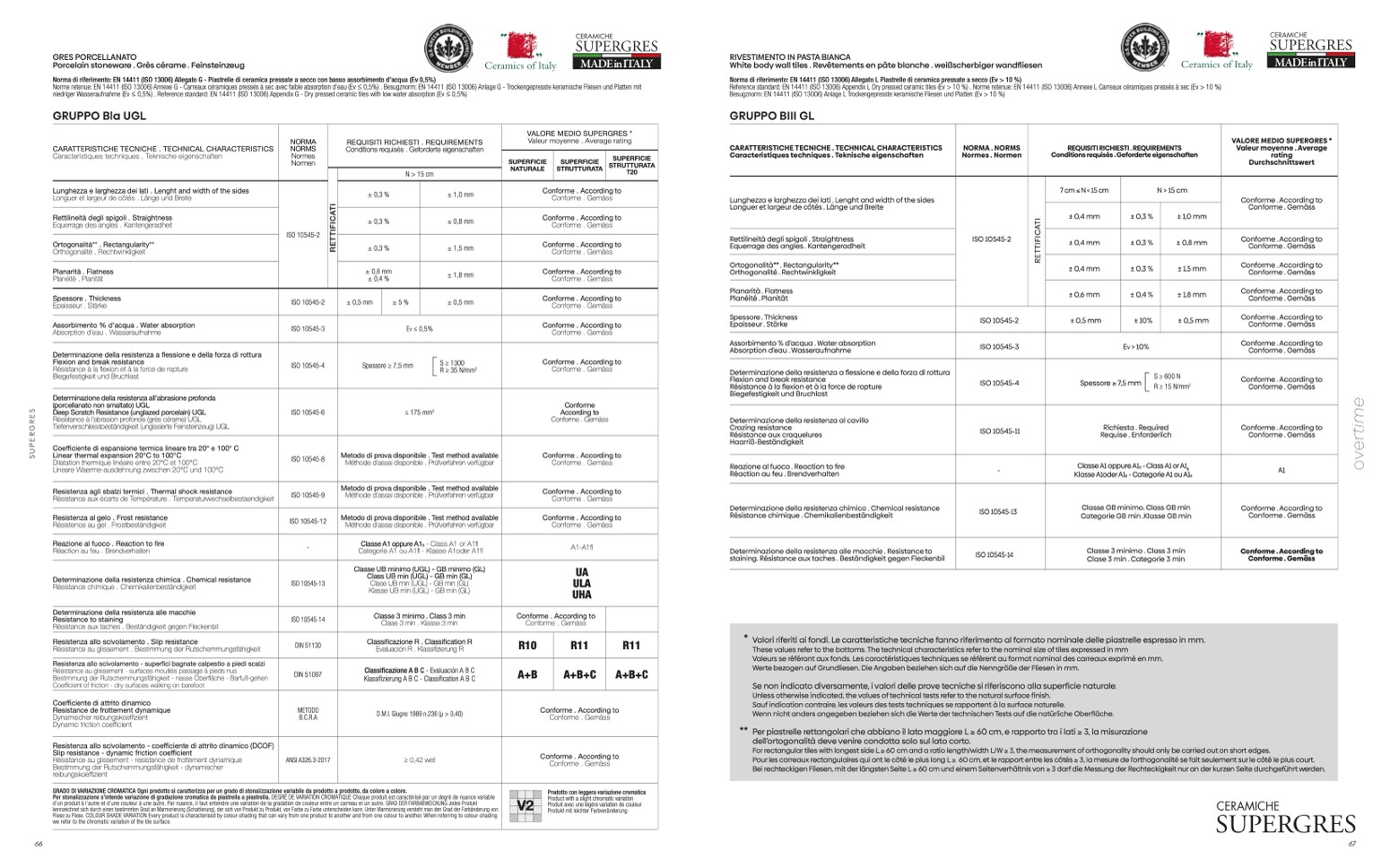 Norma di riferimento: EN 14411 (ISO 13006) Allegato G - Piastrelle di ceramica pressate a secco con basso assorbimento d’acqua (Ev 0,5%)