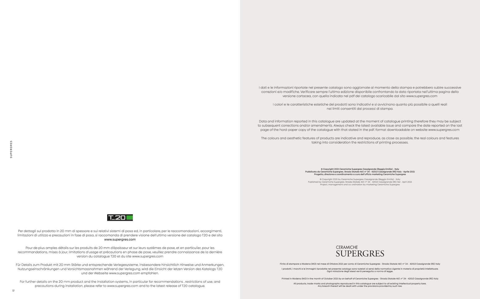 Printed in Modena (MO) in the month of October 2021 by on behalf of Ceramiche Supergres - Strada Statale 467, n° 34 - 42013 Casalgrande (RE) Italy