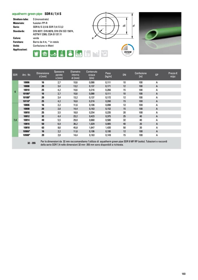 Per le dimensioni da 32 mm raccomandiamo l‘utilizzo di aquatherm green pipe SDR 9 MF RP (sotto). Tubazioni e raccordi